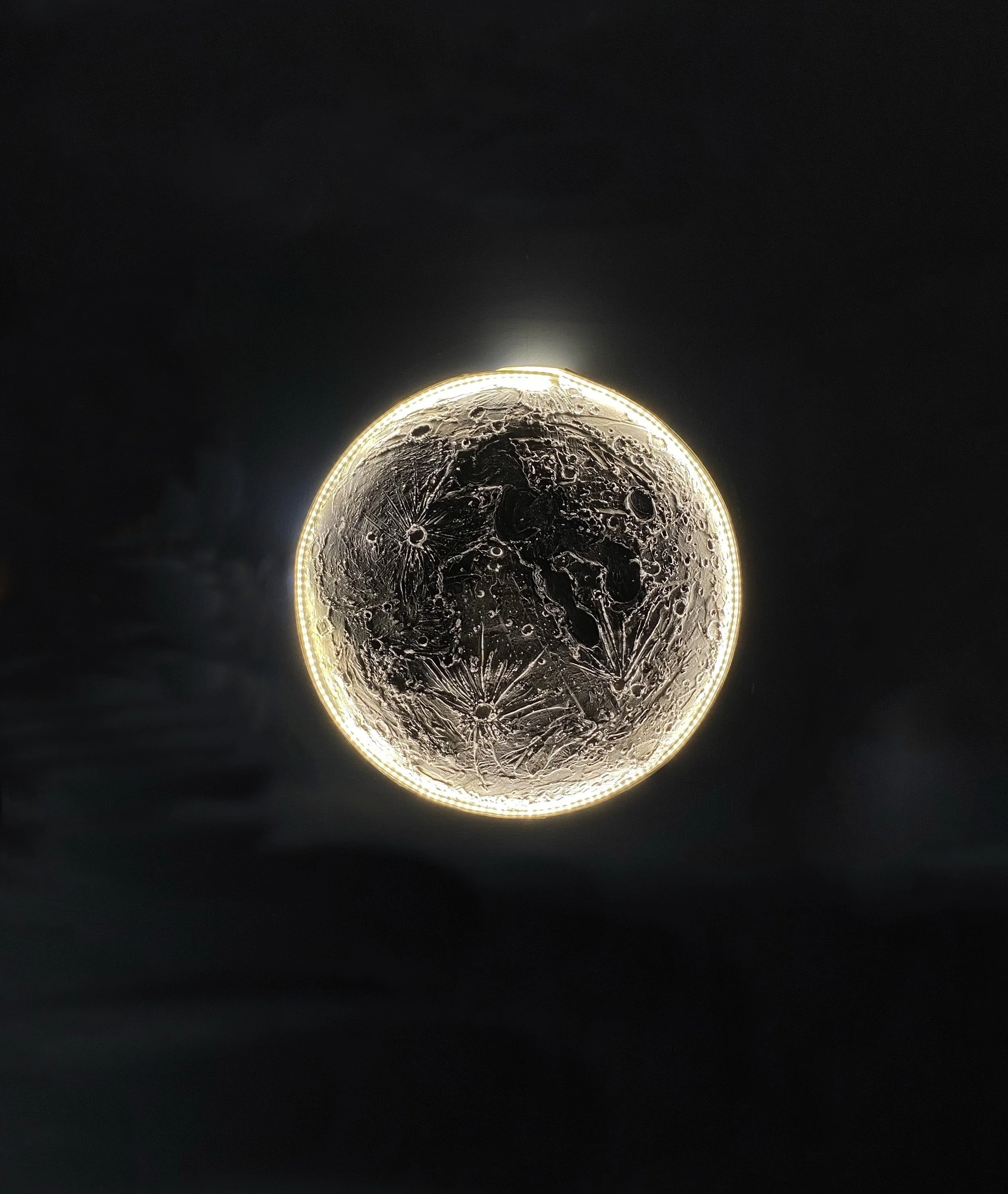A mesmerizing 3D moon art masterpiece, blending tactile texture paint to simulate lunar terrain with an enchanting LED strip that bathes the surface in an ethereal, ever-changing lunar luminescence, creating a captivating and immersive celestial experience.